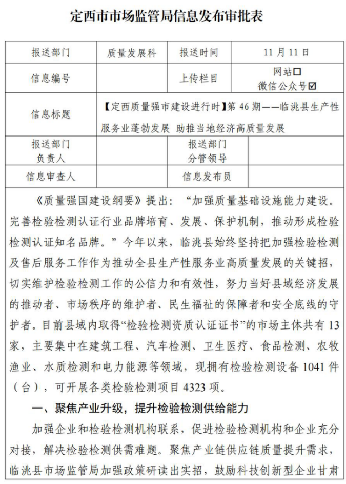 “三審三校”制度落實情況 (三)深化政務公開內容,積極回應群眾關切。我局秉持“應公開、盡公開”的原則,不斷拓展政務公開的邊界。除依法不予公開的信息外,機構設置、職能職責、工作進展、政策法規、規劃計劃、財政信息等均全面公開。今年,我們累計公開各類信息241條,其中工作動態信息91條,行政處罰公開36條、消費提示32條。聚焦食品、藥品、特種設備和工業產品質量“三品一特”安全領域和服務全市經濟社會高質量追趕發展,深入開展政府信息公開,大力推動各項重點工作任務落實見效。